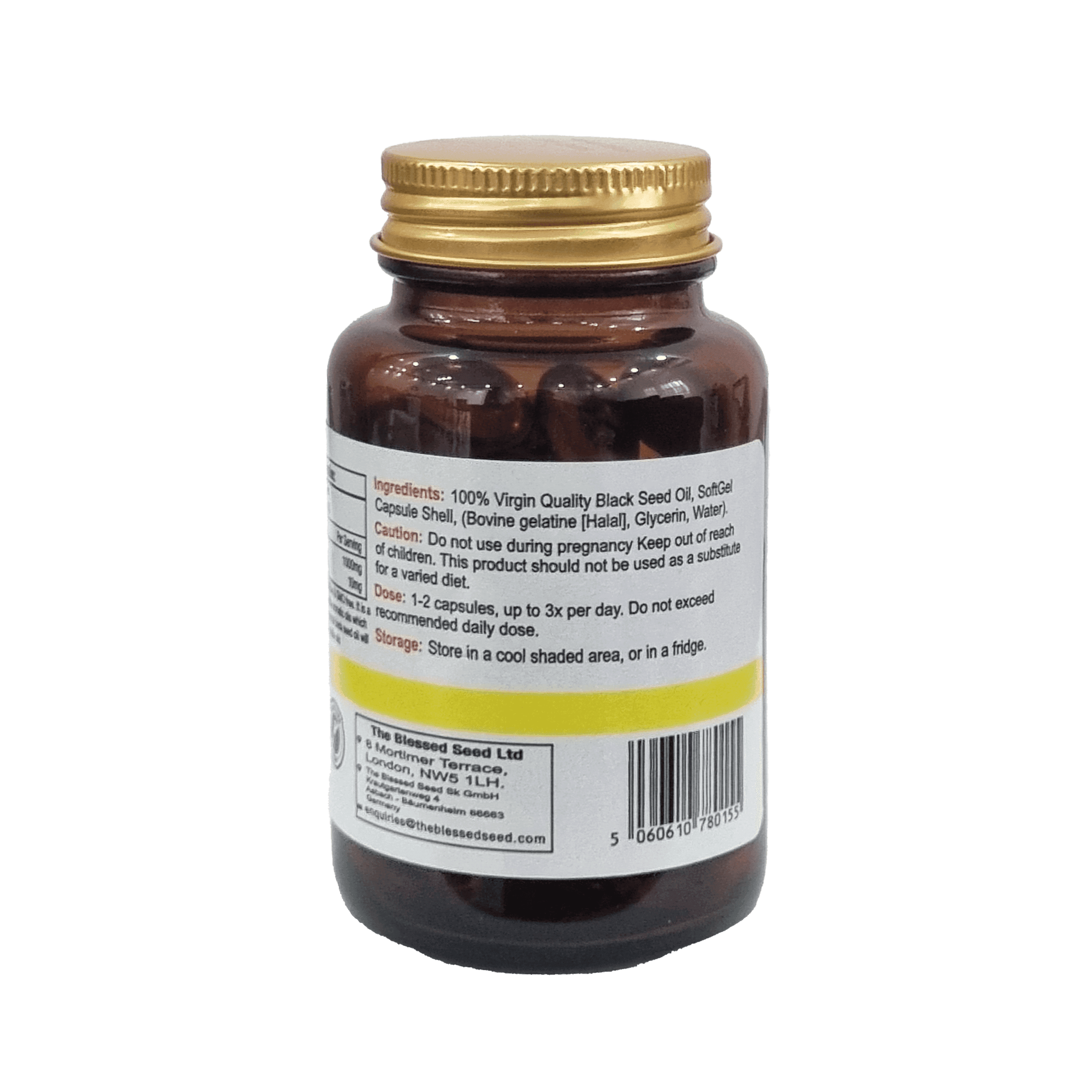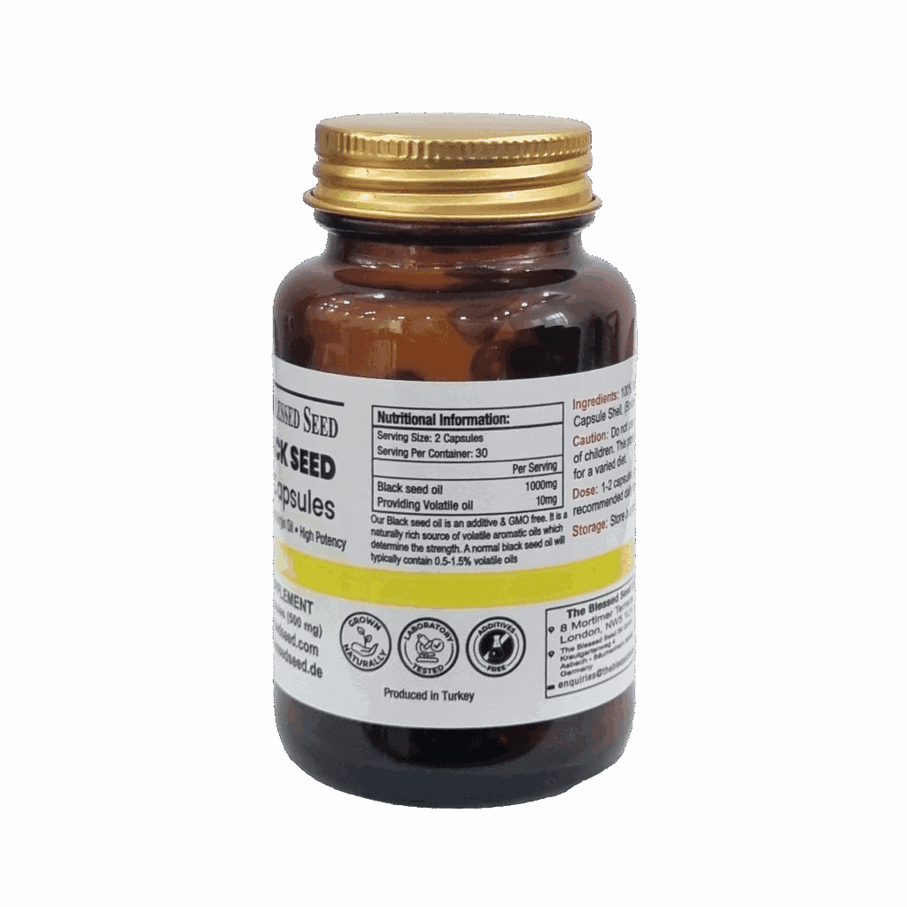 Login to see pricesOur mild black seed oil capsules typically contain about 1% of volatile oil. It is 100% pure, cold pressed black seed oil packaged in halal beef gelatin capsules.