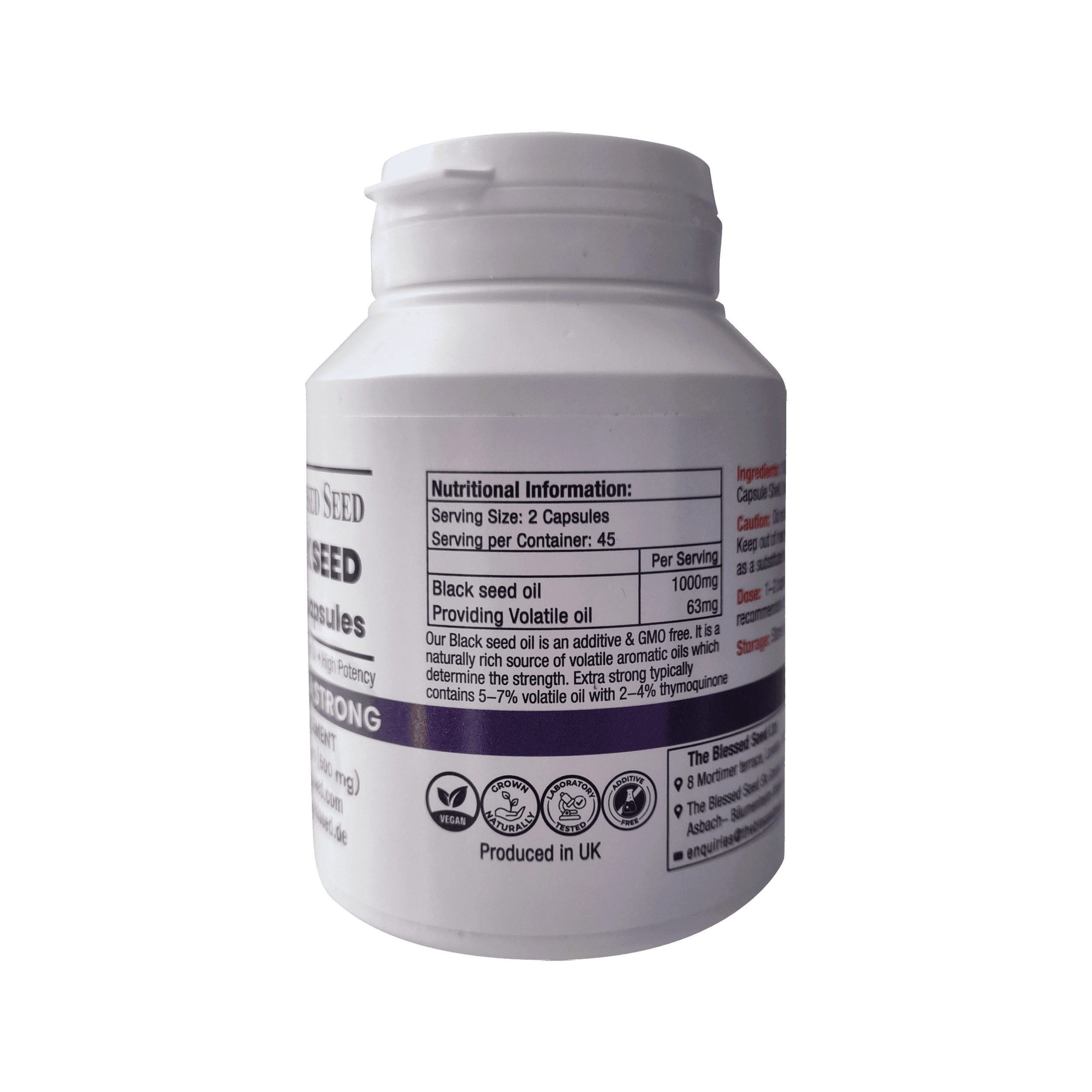 Our extra strong black seed oil capsules, although more expensive than the oil, are a very convenient option for those living a fast-paced life or just wanting an easier method to use the product. Containing a high content of volatile oil and thus higher properties our vegan extra strong black seed oil capsules are pre-measured for you.